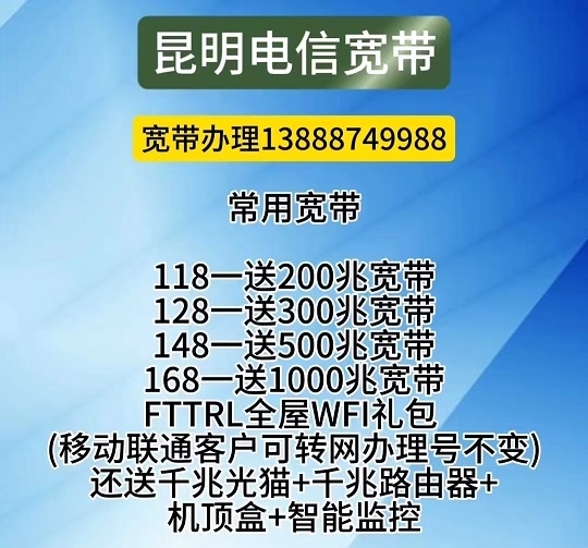 昆明电信宽带安装 电话13888749988范围:官渡、五华、西山、盘龙、呈贡、安宁、东川、富民、晋宁、禄劝、石林、寻甸、宜良、嵩明。 多种宽带